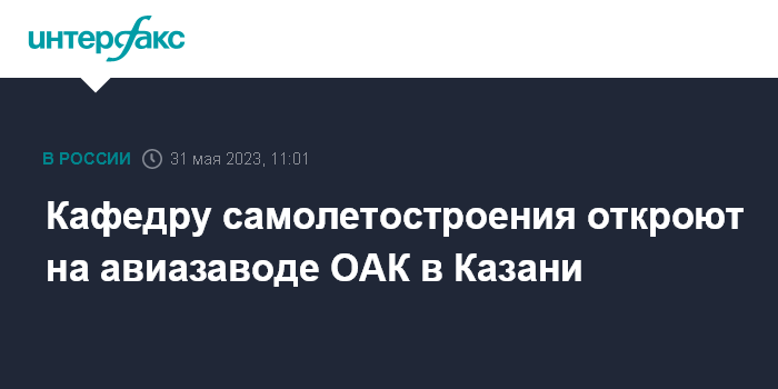 Москва. 31 мая. INTERFAX.RU - Казанский национальный исследовательский технический университет им. А.Н.Туполева-КАИ организует кафедру "Самолетостроение" на авиазаводе ОАК в Казани, сообщается на сайте корпорации.