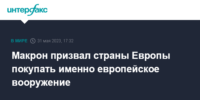 Москва. 31 мая. INTERFAX.RU - Европейским странам для большей независимости в сфере безопасности нужно отдавать приоритет закупкам оружия, произведенного в Евросоюзе, заявил на саммите lobsec в Братиславе президент Франции Эммануэль Макрон.