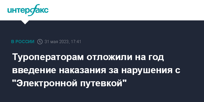 Москва. 31 мая. INTERFAX.RU - Госдума перенесла срок вступления в силу норм об ответственности для туроператоров при внесении ими данных в единую информационную систему "Электронная путевка" на год, на 1 сентября 2024 года, сообщила пресс-служба Минэкономразвития.