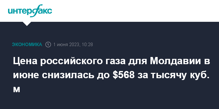 Москва. 1 июня. INTERFAX.RU - Закупочная стоимость российского газа для Молдавии в июне составит $568,15 за тысячу кубометров, сообщил председатель правления "Молдовагаза" Вадим Чебан в своем телеграм-канале.
