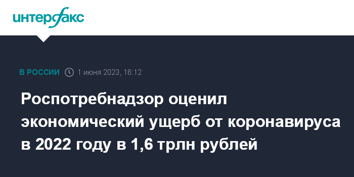 Москва. 1 июня. INTERFAX.RU - Экономический ущерб Российской Федерации от коронавирусной инфекции в 2022 году составил порядка 1,6 триллионов рублей. Об этом говорится в докладе Роспотребнадзора, опубликованном на сайте ведомства в четверг.