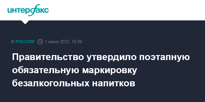 Москва. 1 июня. INTERFAX.RU - Правительство РФ утвердило решение о поэтапном введении обязательной маркировки безалкогольных напитков. Согласно опубликованному на официальном портале правовой информации распоряжению кабмина, с 1 сентября 2023 года начнется регистрация производителей безалкогольных напитков в системе маркировки.