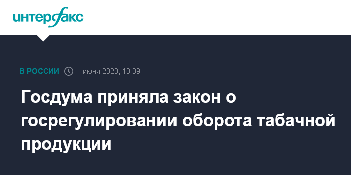 Москва. 1 июня. INTERFAX.RU - Госдума приняла во втором и третьем чтении проект отдельного отраслевого закона, который по аналогии с алкогольным рынком устанавливает государственное регулирование производства и оборота табачных изделий, табачной продукции, никотинсодержащей продукции и сырья для их производства.