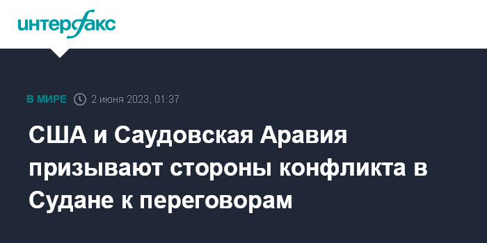 Москва. 2 июня. INTERFAX.RU - США и Саудовская Аравия, выступающие посредниками на переговорах между суданскими армией и силами быстрого реагирования (СБР), заявили, что обеспокоены нарушением соглашения о прекращении огня в Судане и приостановке диалога между сторонами конфликта.