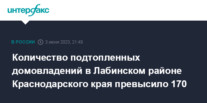 Москва. 3 июня. INTERFAX.RU - Спасатели продолжают ликвидировать последствия непогоды в Лабинском районе Краснодарского края, где оказались затопленными более 170 домовладений, сообщает в субботу в телеграм-канале глава района Владимир Забураев.