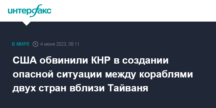 Москва. 4 июня. INTERFAX.RU - Индо-Тихоокеанское командование вооруженных сил США обвинило Китай в небезопасных маневрах китайского эсминца перед американским кораблем в Тайванском проливе.
