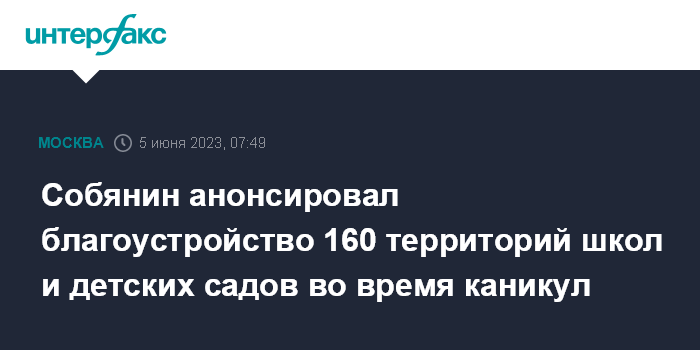 Москва. 5 июня. INTERFAX.RU - В столице более 160 территорий школ и детских садов будут благоустроены во время каникул, сообщил мэр Москвы Сергей Собянин.