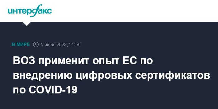 "В июне 2023 года ВОЗ перейдет к системе цифровой сертификации Европейского союза по COVID-19, чтобы создать глобальную систему, которая поможет облегчить глобальную мобильность и защитить граждан во всем мире от текущих и будущих угроз здоровью", - говорится в заявлении ЕК, опубликованном в понедельник в Брюсселе.