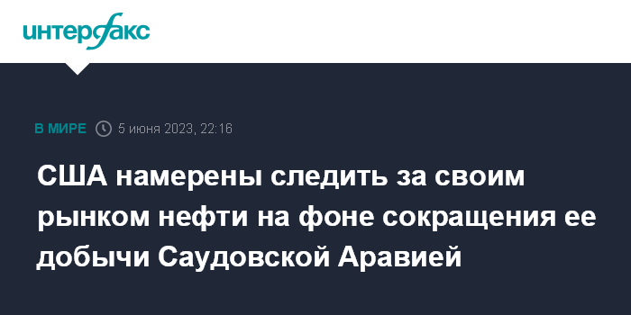 Москва. 5 июня. INTERFAX.RU - В Вашингтоне следят за важным для американской экономики балансом спроса и предложения на нефтяном рынке после заявления Саудовской Аравии о сокращении добычи нефти, заявил в понедельник представитель Совета национальной безопасности США Джон Кирби.