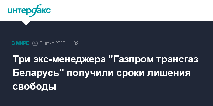 Москва. 6 июня. INTERFAX.RU - Ленинский районный суд Минска приговорил трех бывших топ-менеджеров ОАО "Газпром трансгаз Беларусь" к длительным срокам заключения по обвинению в получении взяток за содействие при проведении конкурсных процедур, заключении и исполнении договоров, а также монтаже оборудования в период 2019-2022 годов.