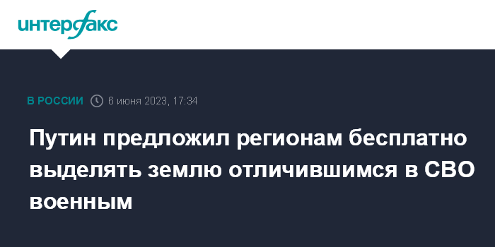 Москва. 6 июня. INTERFAX.RU - Президент РФ Владимир Путин рекомендовал региональным властям за исключением Москвы, Санкт-Петербурга и Севастополя определить условия бесплатного выделения земельных участков в собственность военнослужащим, участникам добровольческих формирований и сотрудникам Росгвардии, которые удостоены звания Героя России или орденами за участие в специальной военной операции, а также являются ветеранами боевых действий.