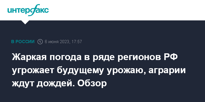 Москва. 6 июня. INTERFAX.RU - Жаркая погода, которая стоит в последнее время на Урале, в Поволжье и Сибири, стала реальной угрозой для будущего урожая, прежде всего зерна, считают эксперты, опрошенные "Интерфаксом".
