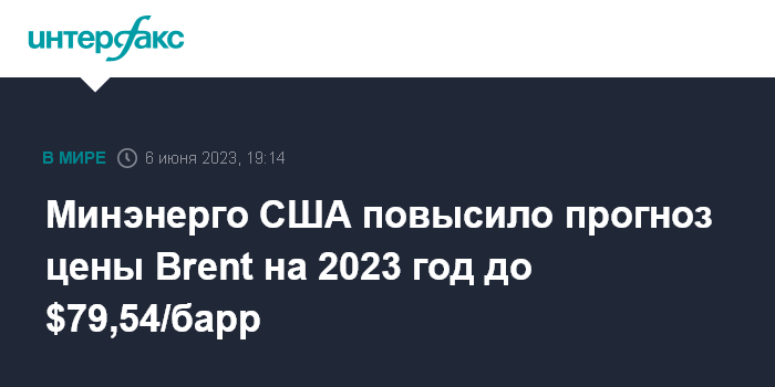 Москва. 6 июня. INTERFAX.RU - Минэнерго США повысило ожидания по цене нефти сорта Brent на 2023 год с $78,65/барр. до $79,54/барр. Об этом говорится в ежемесячном прогнозе управления энергетической информации ведомства (EIA).