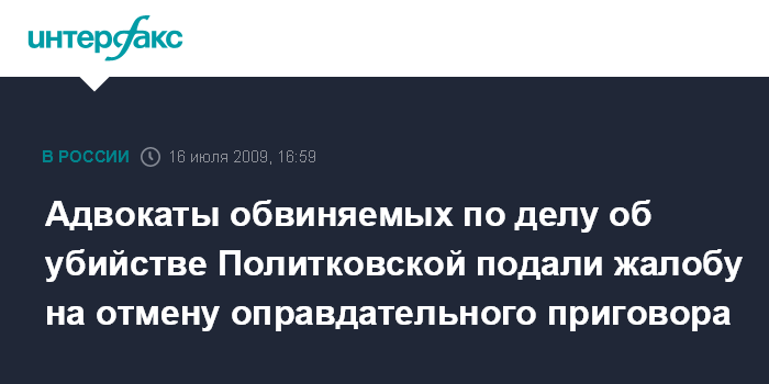 Москва. 16 июля. INTERFAX.RU - Адвокаты обвиняемых по делу об убийстве обозревателя "Новой газеты" Анны Политковской подали надзорную жалобу в президиум Верховного суда РФ на отмену оправдательного приговора. "В надзорной жалобе просим отменить определение судебной коллегии и направить дело на новое кассационное рассмотрение", - сообщил "Интерфаксу" адвокат одного из обвиняемых по делу Мурад Мусаев.