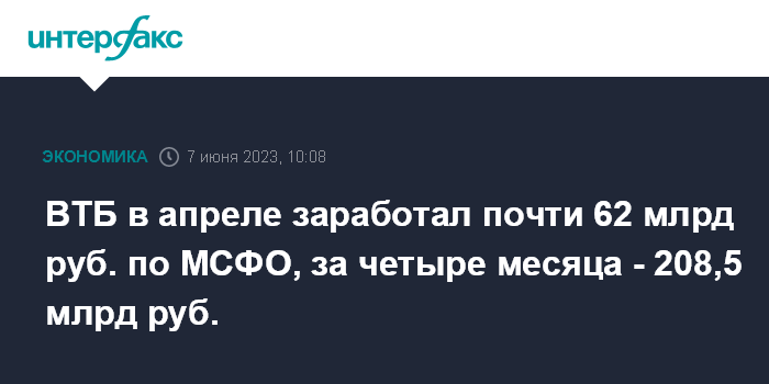 Москва. 7 июня. INTERFAX.RU - ВТБ в апреле получил чистую прибыль по МСФО в размере 61,8 млрд рублей, за четыре месяца - 208,5 млрд рублей, говорится в сообщении госбанка.