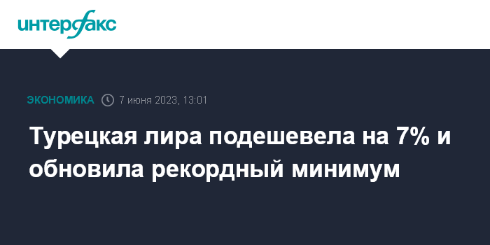 Москва. 7 июня. INTERFAX.RU - На торгах 7 июня падение курса турецкой лиры к доллару США превышает 7%, что является максимальным темпом снижения за последний год.