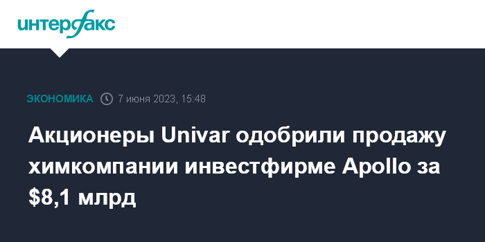 Москва. 7 июня. INTERFAX.RU - Акционеры Univar Solutions одобрили продажу компании, занимающейся поставками химической продукции, инвестиционной фирме Apollo Global Management за $8,1 млрд с учетом долга.