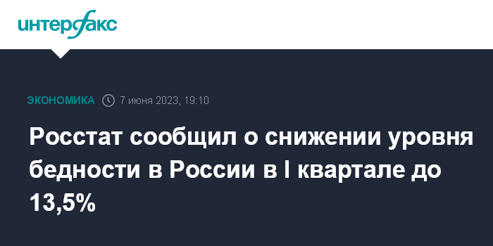 Москва. 7 июня. INTERFAX.RU - Численность населения России с доходами ниже прожиточного минимума в I квартале 2023 года составила 19,6 млн человек против 20,9 млн годом ранее, сообщил Росстат. Уровень бедности в стране в I квартале 2023 года снизился до 13,5% против 14,3% в I квартале 2022 года.