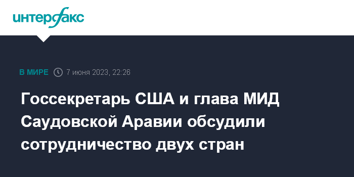 Москва. 7 июня. INTERFAX.RU - Госсекретарь США Энтони Блинкен и министр иностранных дел Саудовской Аравии принц Фейсал бен Фархан Аль Сауд провели переговоры в Эр-Рияде, сообщают в среду саудовские СМИ.