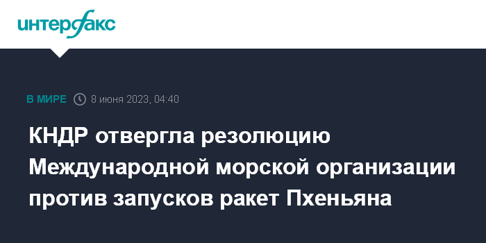 Москва. 8 июня. INTERFAX.RU - Пхеньян не признает резолюцию, осуждающую запуски КНДР ракет, которую приняла Международная морская организация (IMO), заявил представитель северокорейского Государственного управления морской инспекции.