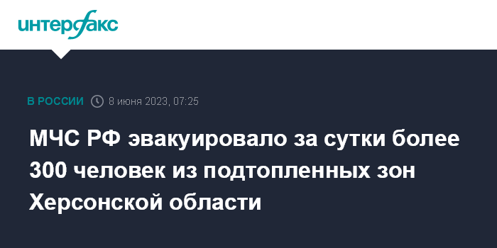 Москва. 8 июня. INTERFAX.RU - Cотрудникам МЧС РФ удалось эвакуировать за сутки более 300 человек, в том числе 70 детей, с подтопленных территорий в Херсонской области, сообщила пресс-служба министерства в четверг.