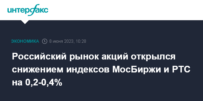 Российский рынок акций открылся снижением индексов МосБиржи и РТС на 0,2-0,4%