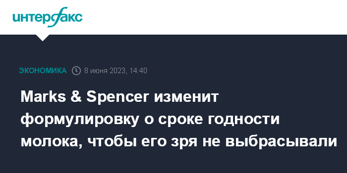 Москва. 8 июня. INTERFAX.RU - Британская сеть универмагов Marks & Spencer перестанет указывать срок годности в жесткой формулировке "use-by" (используйте до даты) на упаковках молока собственного бренда, чтобы молоко меньше выбрасывали, пишет The Guardian.