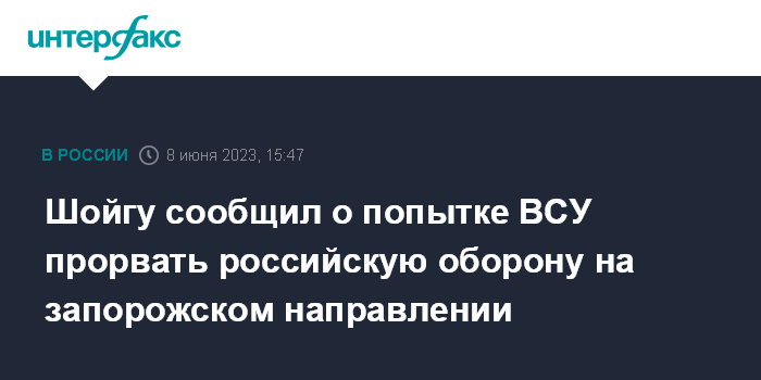 Москва. 8 июня. INTERFAX.RU - ВСУ в четверг предприняли попытку прорыва обороны российских военных на запорожском направлении, заявил министр обороны РФ Сергей Шойгу.