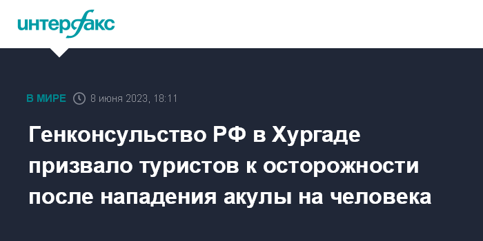 Москва. 8 июня. INTERFAX.RU - Генконсульство РФ в Хургаде подтвердило, что в районе пляжа отеля Dream Beach акула напала на человека, он погиб.