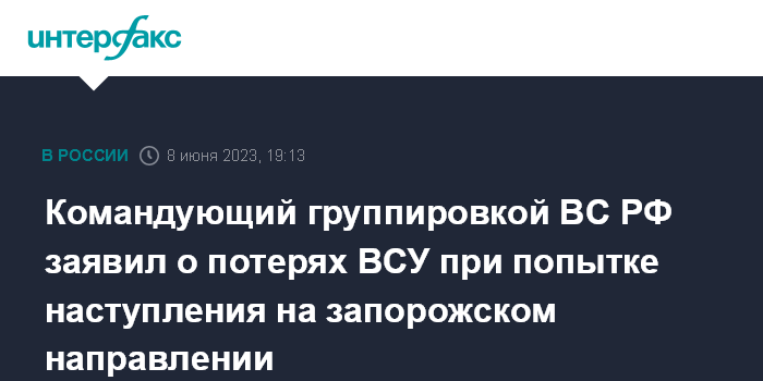 Командующий группировкой ВС РФ заявил о потерях ВСУ при попытке наступления на запорожском направлении
