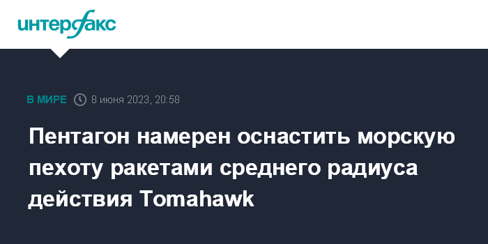 Москва. 8 июня. INTERFAX.RU - Американские морпехи к 2030 году получат на вооружение комплексы крылатых ракет наземного базирования Tomahawk, которые были запрещены по Договору о ликвидации ракет средней и меньшей дальности (ДРСМД) между СССР и США, сообщило издание The Drive со ссылкой на представителя Корпуса морской пехоты Кэти Клоуз.