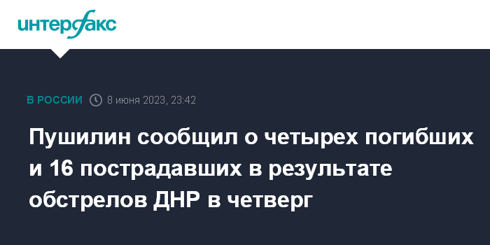 Москва. 8 июня. INTERFAX.RU - Четыре человека погибли, еще 16 пострадали в результате обстрелов ДНР в четверг, заявил врио главы республики Денис Пушилин.