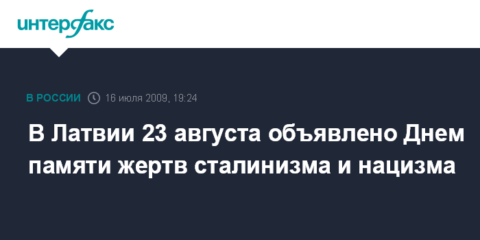 Рига. 16 июля. INTERFAX.RU - Сейм Латвии на внеочередном заседании в четверг после бурных дебатов принял в окончательном чтении предложение правящей коалиции объявить 23 августа днем памяти жертв сталинизма и нацизма.