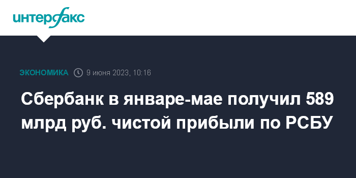 Москва. 9 июня. INTERFAX.RU - Сбербанк в январе-мае 2023 года получил 589,0 млрд рублей чистой прибыли по РСБУ, в том числе в мае - 118,1 млрд рублей прибыли, говорится в сообщении кредитной организации.