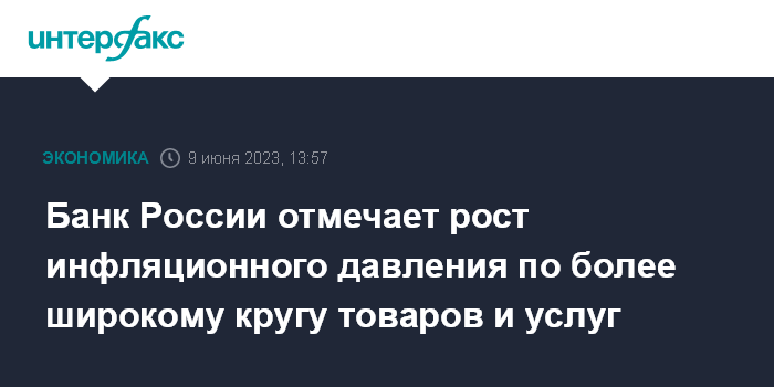 Москва. 9 июня. INTERFAX.RU - Рост инфляционного давления проявляется по все более широкому кругу товаров и услуг, это во многом связано с восстанавливающимся потребительским спросом и постепенным переносом в цены произошедшего с начала 2023 года ослабления рубля, говорится в пресс-релизе Банка России по итогам заседания совета директоров.