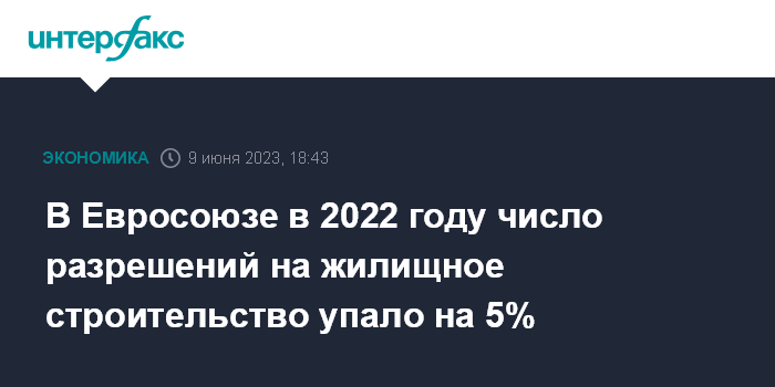 Москва. 9 июня. INTERFAX.RU - Количество разрешений на жилищное строительство (в пересчете на полезную площадь) в Евросоюзе в 2022 году сократилось почти на 5% - до 386,7 млн кв. метров, сообщил Eurostat.