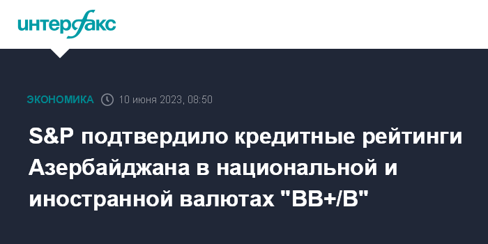 Москва. 10 июня. INTERFAX.RU - Международное рейтинговое агентство S&P Global Ratings подтвердило долгосрочные и краткосрочные кредитные рейтинги Азербайджана по обязательствам в национальной и иностранной валютах на уровне "BB+/B", говорится в пресс-релизе агентства, выдержки из которого приводит "Интерфакс-Азербайджан".