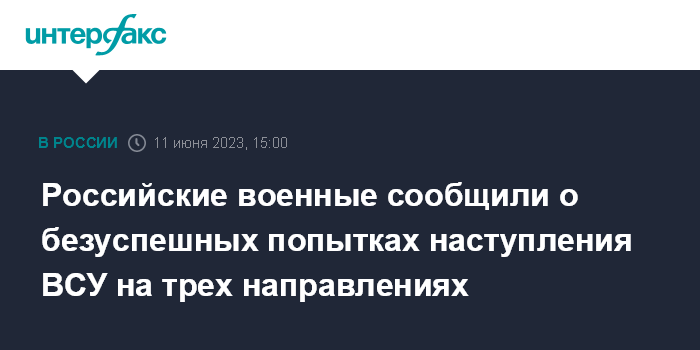 Москва. 11 июня. INTERFAX.RU - Вооруженные силы Украины (ВСУ) в течение минувших суток предпринимали безуспешные попытки наступательных действий на южно-донецком, запорожском и донецком направлениях, сообщил официальный представитель министерства обороны РФ Игорь Конашенков на брифинге в воскресенье.