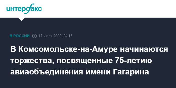 Хабаровск. 17 июля. ИНТЕРФАКС-ДАЛЬНИЙ ВОСТОК - В г. Комсомольске-на-Амуре Хабаровского края в предстоящие два дня пройдут торжественные мероприятия, посвященные 75-ой годовщине создания в городе авиационно-производственного объединения (КнААПО) имени Гагарина.