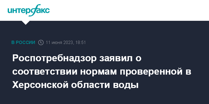 Москва. 11 июня. INTERFAX.RU - Питьевая вода в населенных пунктах Херсонской области, где специалисты смогли отобрать пробы из распределительной сети, соответствуют нормативным показателям, сообщили в воскресенье в Роспотребнадзоре.