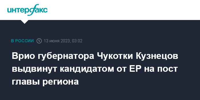 Москва. 13 июня. INTERFAX.RU - Чукотское региональное отделение партии "Единая Россия" выдвинуло врио губернатора округа Владислава Кузнецова кандидатом на выборы губернатора Чукотского автономного округа, сообщается на сайте отделения.