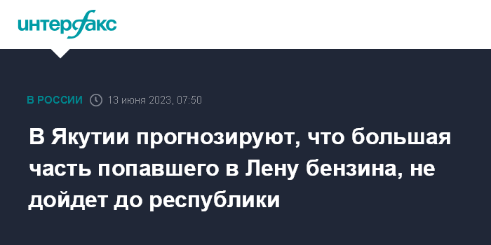 Москва. 13 июня. INTERFAX.RU - Власти Якутии прогнозируют, что большая часть бензина, попавшего в реку Лена после столкновения двух танкеров в Иркутской области, испарится и не дойдет до границ республики.
