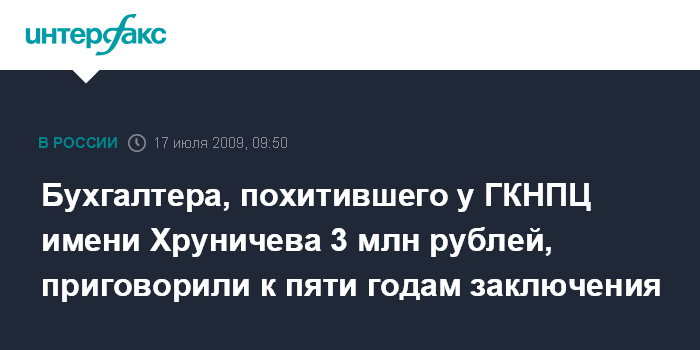 Бухгалтера, похитившего у ГКНПЦ имени Хруничева 3 млн рублей, приговорили к пяти годам заключения