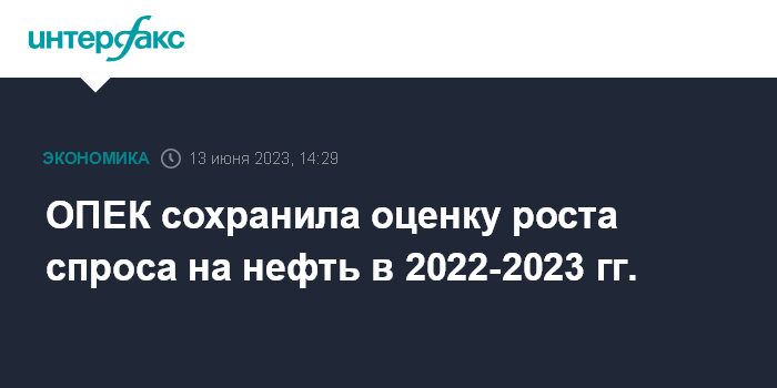 Москва. 13 июня. INTERFAX.RU - ОПЕК оставила без изменений оценку спроса на нефть в 2022 и 2023 годах - 99,6 млн и 101,9 млн баррелей в сутки соответственно, говорится в ежемесячном отчете альянса.