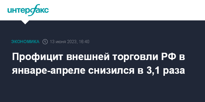 Москва. 13 июня. INTERFAX.RU - Положительное сальдо внешней торговли РФ, определенное по методологии платежного баланса, в январе-апреле 2023 года составило $36,419 млрд, что на 68%, или в 3,1 раза, меньше, чем за аналогичный период 2022 года, сообщается Банк России.