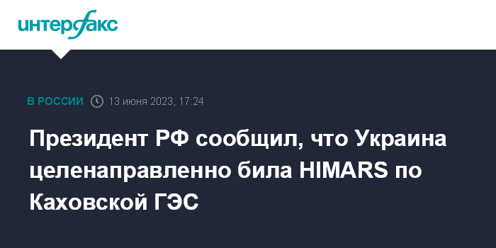 Москва. 13 июня. INTERFAX.RU - В разрушении Каховской ГЭС виновата украинская сторона, которая целенаправленно била по гидроэлектростанции ракетами HIMARS, заявил президент РФ Владимир Путин.