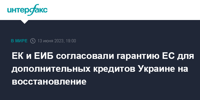 Москва. 13 июня. INTERFAX.RU - Еврокомиссия (ЕК) и Европейский инвестиционный банк (ЕИБ) договорились о гарантии ЕС, позволяющей ЕИБ предоставить Украине новые кредиты на сумму 100 млн евро для быстрого восстановления, например, для ремонтов муниципальной или энергетической инфраструктур.