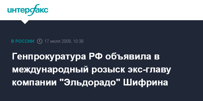 "Генеральная прокуратура России направила в НЦБ Интерпола в РФ поручение об объявлении бывшего гендиректора ООО "Эльдорадо" А.Шифрина в международный розыск", - заявила "Интерфаксу" в пятницу официальный представитель ведомства Марина Гриднева.