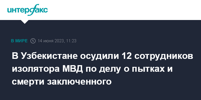 Москва. 14 июня. INTERFAX.RU - Суд Ташкентской области Узбекистана признал виновными в пытках и гибели осужденного 12 бывших сотрудников следственного изолятора МВД и приговорил их к лишению свободы на сроки от трех до четырех лет, сообщила в среду пресс-службы Верховного суда республики.