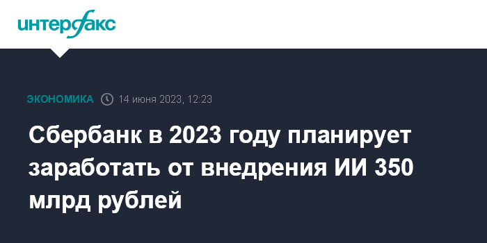 Москва. 14 июня. INTERFAX.RU - Сбербанк в 2023 году планирует получить от внедрения технологий искусственного интеллекта 350 млрд рублей, сообщил первый зампред правления банка Александр Ведяхин журналистам в рамках ПМЭФ.